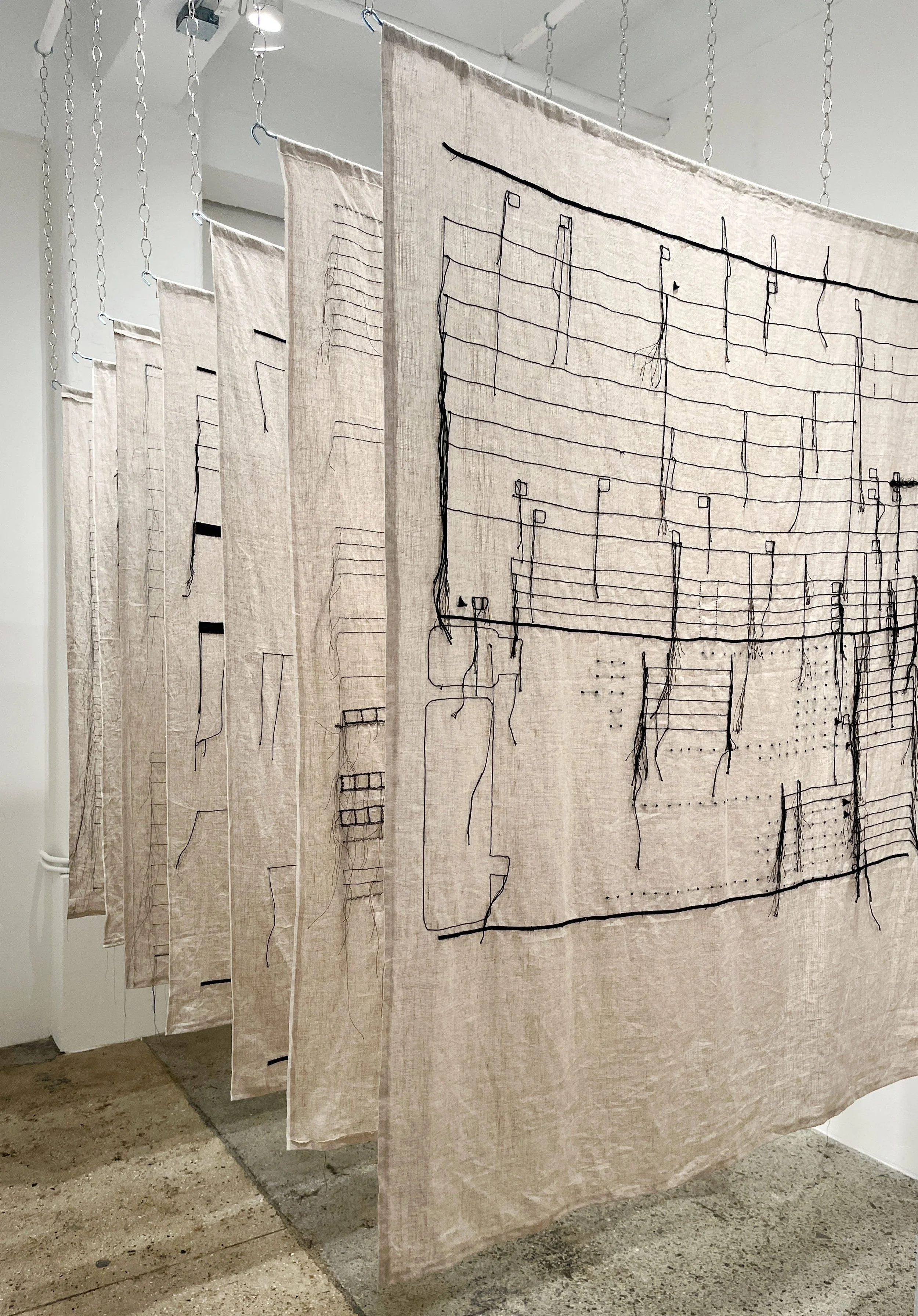 A textile-based installation in the front gallery, Return and Schedule Self-Interest, is comprised of a series of hanging embroidered textile panels. The pattern of the stitching reproduces the lines from an income tax form 1040, here enlarged to scale of the human body. Viewers can physically walk between the sheets, sandwiched within them. As the artist says, “Through textiles and scale, the work speaks to the emotional, and often traumatic impact, that this notoriously boring and onerous, yet potent and ever-present, apparatus has on us individually and collectively.” Evoking the work of Mona Hatoum and Agnes Martin, the piece can also be related to Peter Halley’s cells and conduits, in which the control of bodies by architecture and systems — both physical and metaphorical — is made manifest.