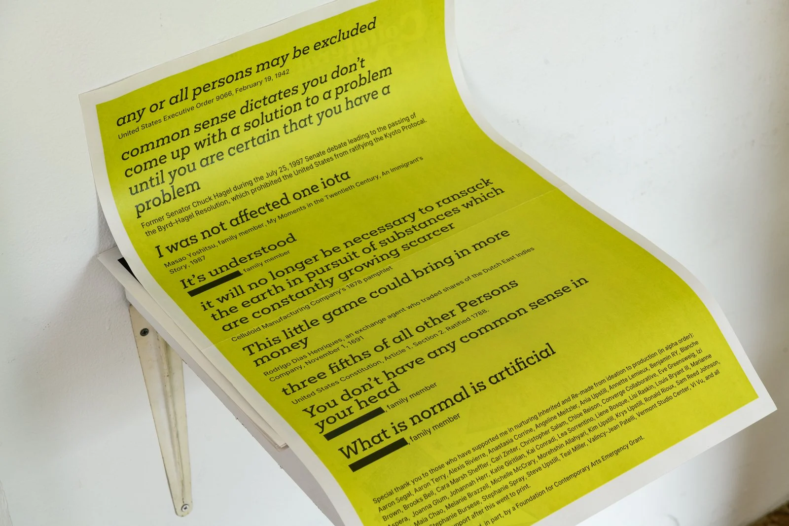 Newspaper poster take-away provides list of quotations in installation and their references.